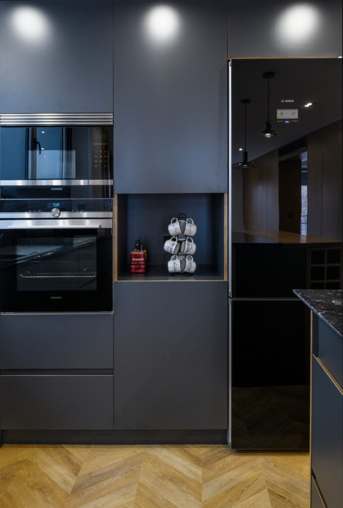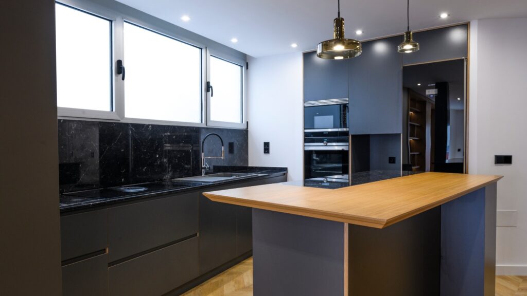 La zona de estar se completa con una cocina abierta al salón, resuelta en tonos negros que aportan sofisticación y carácter, integrándose perfectamente en el espacio. El conjunto se remata con un espectacular mueble de salón que combina madera y mármol, logrando un equilibrio perfecto entre calidez y diseño.